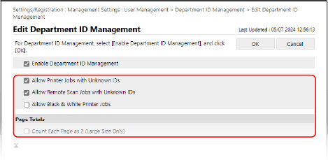Quando a caixa de seleção [Allow Printer Jobs with Unknown IDs] estiver desmarcada, é possível marcar a caixa de seleção [Allow Black & White Printer Jobs] para permitir a impressão em preto e branco para uma ID de Departamento desconhecida.