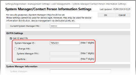Para alterar o PIN, marque a caixa de seleção [Change PIN] e digite o mesmo PIN em [System Manager PIN] e [Confirm].