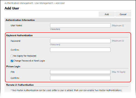 Em [Keyboard Authentication], configure a senha a ser inserida quando fizer login. Insira a mesma senha em [Password] e [Confirm].