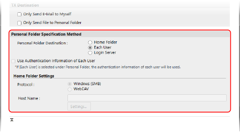 Quando o usuário quer especificar a pasta ou definir o nome de usuário e senha para a Pasta Pessoal, é possível selecionar [