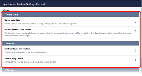 Se as informações de usuário na máquina servidor for necessária na máquina cliente na qual a sincronização foi interrompida, exporte os dados personalizados da máquina servidor e importe-os na máquina cliente. Para preparar essa operação, exporte os dados personalizados gerenciados na máquina servidor.