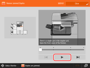 * A tela continua aparecendo até o encravamento do papel ou grampo ser resolvido. Quando pressiona [Close], a tela pode fechar temporariamente e você pode fazer outra operação ou configuração.