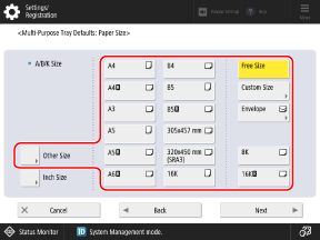 For the sizes of paper that are displayed when [Other Size] is pressed, see the following: