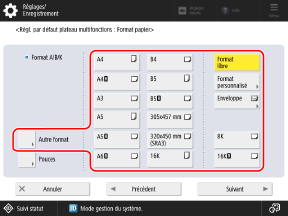 Pour les formats de papier qui s'affichent en appuyant sur [Autre format], voir :