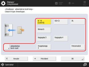 Appuyez sur [Alimentation bord long] ou [alimentation bord court] en fonction de l'orientation des enveloppes, puis sélectionnez le format des enveloppes.