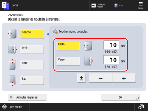 Si vous spécifiez une valeur négative, la marge est créée du côté opposé à la position sélectionnée à l'étape 2. Utilisez ce réglage pour réduire la largeur de la marge quand vous copiez un original qui a déjà une gouttière.