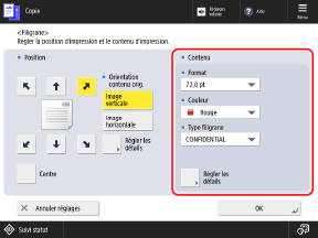 Vous pouvez appuyer sur [Régler les détails] pour changer les pages sur lesquelles imprimer le filigrane ou changer la méthode d'impression (transparent ou surimpression).