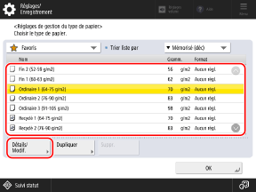 Sélectionnez le papier personnalisé mémorisé dans la liste et appuyez sur [Détails/Modif.].
