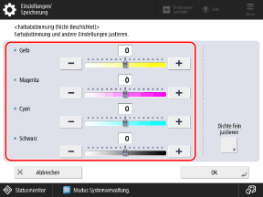 Verwenden Sie das Bedienfeld, um die Farbbalance anzupassen. Sie können die Anpassung nicht über Remote UI von einem Computer aus vornehmen.