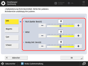 Passen Sie die Farbbalance von Gelb, Magenta, Cyan und Schwarz an, wenn Sie in Farbe drucken. Sie können die Werte der drei Dichtebereiche für jede Farbe anpassen.