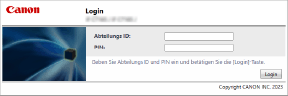 Wenn die Verwaltung per Abteilungs-ID aktiviert ist, müssen Sie die Abteilungs-ID und die -PIN eingeben, um sich über das Bedienfeld oder die Remote UI anzumelden.