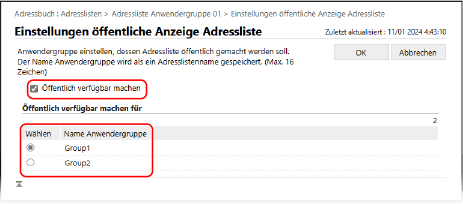 Eine Benutzergruppen-Adressliste kann nur für eine Benutzergruppe öffentlich gemacht werden.