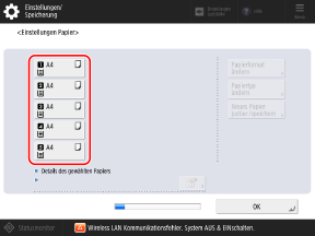 Überprüfen Sie, ob die Formate des eingelegten Papiers auf dem Bildschirm [Einstellungen Papier] angezeigt werden.