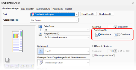 Vergewissern Sie sich, dass unter [Ausrichtung] auf der Registerkarte [Grundeinstellungen] die [Ausrichtung] auf dieselbe Ausrichtung eingestellt ist, die Sie in Schritt