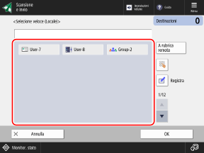 Quando molti utenti specificano di frequente una particolare destinazione, è possibile facilitare le operazioni registrando quella destinazione in un pulsante di selezione veloce. Poiché le destinazioni registrate vengono visualizzate sotto forma di pulsanti di selezione veloce nella schermata di scansione o fax, è possibile specificare una destinazione con un solo tocco di un pulsante.