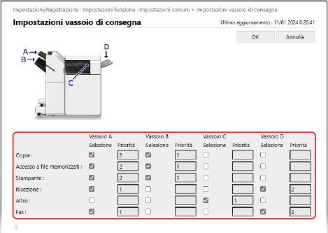 È anche possibile specificare più vassoi di consegna per ogni funzione e assegnare un livello di priorità. In questo caso, quando il vassoio di consegna con il livello di priorità più alto raggiunge la massima capacità, la destinazione di uscita passa automaticamente a un vassoio con priorità più bassa.