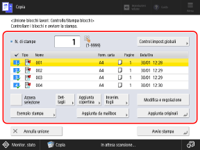 Viene visualizzata la schermata [Unione blocchi lavori: Controllo/Stampa blocchi].