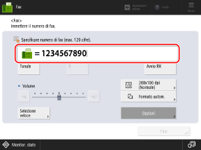 Quando si inserisce il numero di fax, è possibile utilizzare impostazioni quali [Tonale] e [Pausa], a seconda della destinazione di invio e del servizio utilizzato.