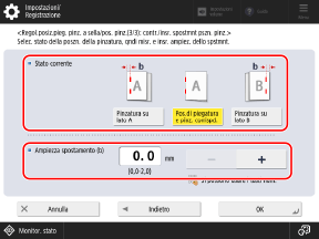 Verificare lo stato corrente della posizione di pinzatura e la larghezza dello spostamento sulla pagina di prova, quindi selezionare lo stato corrente e impostare la larghezza dello spostamento.