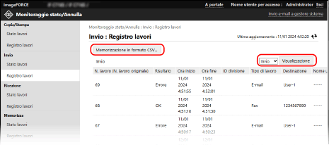 Fare clic su [Memorizzazione in formato CSV] per salvare i registri dei lavori come file CSV sul computer.