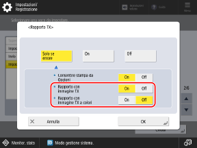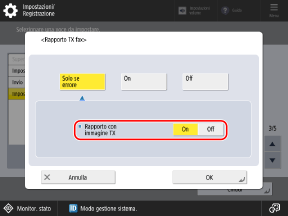 Per stampare un rapporto solo quando si verifica un errore, selezionare [Solo se errore]. In questo caso, impostare [Consentire stampa da Opzioni] su [On] quando si desidera poter impostare se stampare il rapporto dalla schermata di scansione o fax.