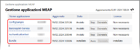È possibile avviare e interrompere l'utilizzo delle applicazioni MEAP e disinstallarle. È inoltre possibile impostare le informazioni di autenticazione delle applicazioni.