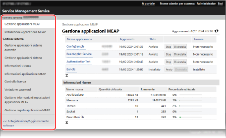 Quando si fa clic su ciascuna voce, viene visualizzata una schermata informativa o di gestione relativa al sistema MEAP.