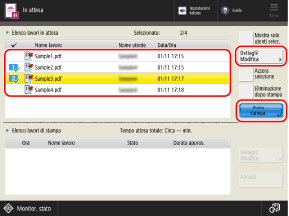 Il documento in attesa può essere stampato dopo averne controllato i dettagli sul pannello di controllo o dopo aver stampato un esempio per verificare il risultato di stampa in modo da evitare stampe indesiderate.