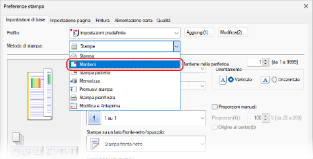 È possibile impostare la funzione In attesa nelle impostazioni di stampa del driver e inviare il documento da mettere in attesa alla macchina.