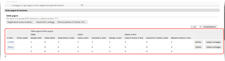 È possibile visualizzare il numero di pagine stampate e copiate per ciascun ID reparto quando la gestione ID reparto è abilitata.