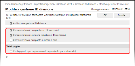 Deselezionare le caselle di controllo [Consentire lavori stampante con ID sconosciuti] e [Consentire lavori scansione remota con ID sconosciuti].