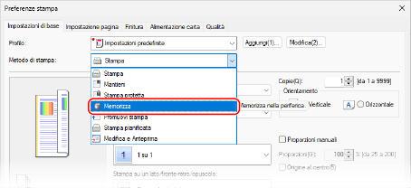 Le impostazioni di stampa configurate qui vengono salvate nel file.