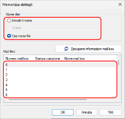 È possibile fare clic su [Recupera informazioni mail box] per visualizzare i nomi delle mailbox registrate.