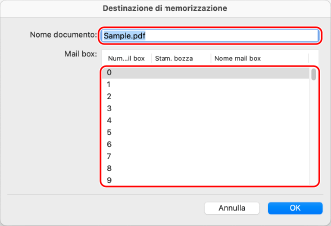 Specificare il nome file al salvataggio e la mailbox da utilizzare come posizione di memorizzazione.