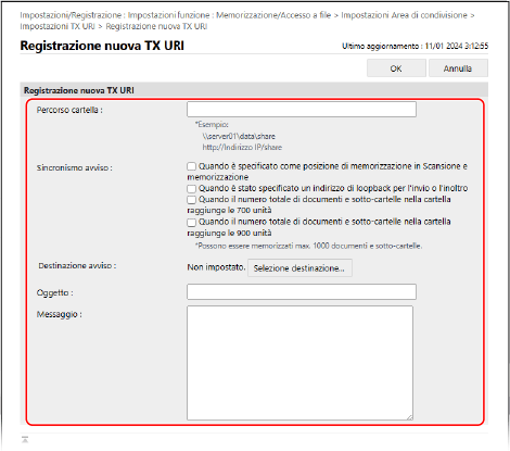 Configurare le impostazioni per inviare notifiche tramite e-mail ogni volta che un file viene salvato in Area di condivisione sulla macchina. Il percorso (URI) per accedere direttamente al file salvato è indicato nell'e-mail.