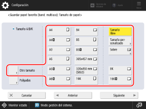 Para los tamaños de papel que aparecen al pulsar [Otro tamaño], consulte lo siguiente: