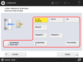Pulse [Alimentación borde largo] o [Alimentación borde corto] según la orientación de los sobres, y seleccione el tamaño del sobre.