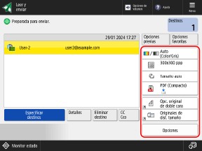 Puede pulsar [Opciones previas] para recuperar las opciones utilizadas para enviar datos escaneados anteriormente. También se aplica el destino de envío junto con la configuración recuperada.