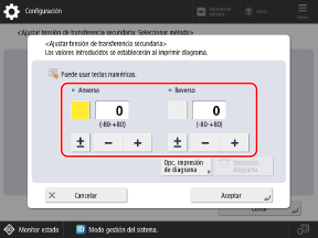Utilice el panel de control para ajustar la tensión de transferencia secundaria. Podrá establecer los valores de ajuste utilizando la IU remota desde un ordenador, pero no podrá imprimir la tabla.
