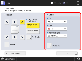 You can add information such as page numbers and the date when copying. You can also add a watermark such as "CONFIDENTIAL." You can also specify a custom string for the watermark.