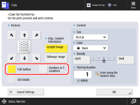 If you set multiple types of information to be printed in the same position, a confirmation screen asking whether to copy with these settings appears when you press [ Start].