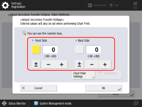 To make fine adjustments to the secondary transfer voltage, set [Chart Print Type] to [For Fine Adjustment]. A chart with the adjustment values in ± 1 increments is printed.