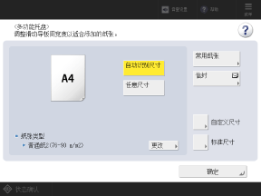 当在多功能托盘中装入纸张时,控制面板上将显示以下屏幕。请根据装入的纸张设置纸张尺寸和类型。