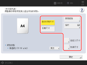 如果装入无法自动检测的纸张尺寸,或者重新装入纸张后仍显示不同的纸张尺寸,请按下 [标准尺寸],然后选择装入的纸张尺寸。