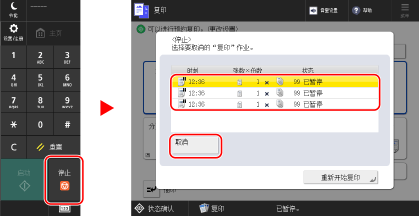 停止],从复印作业列表中选择要取消的作业,然后按 [取消]。