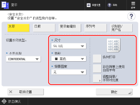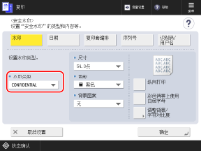 在 [安全水印] 屏幕上配置的设置会应用于样张打印件的字符格式。