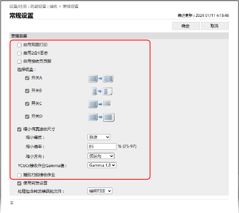 选中 [插印打印接收作业] 复选框。在接收到传真或互联网传真时,机器会中断其他作业并进行插印。