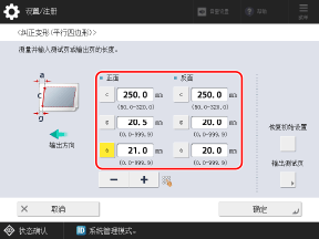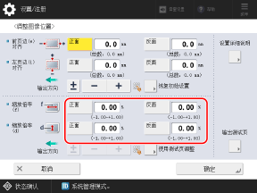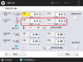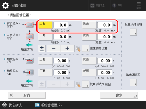 * 在执行调整左边缘对齐或调整前缘对齐后,当显示 [调整图像位置] 屏幕时,屏幕上的值将重置为“0.0 mm”,但保留之前的设置值。如果要重复调整,请检查重新打印的测试页上的指示符并设置该值。
