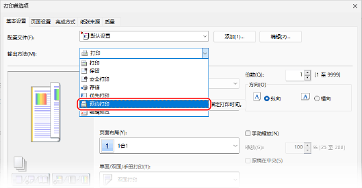 对于 [输出方法],请选择 [预约打印]。