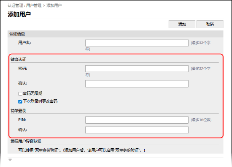 在[键盘认证]中,配置登录时要输入的密码。在[密码] 和 [确认]中输入相同的密码。